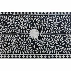 Add a touch of rustic glamour to a dining space or entryway with this striking console table; Made from 100% mango wood and genuine bone inlay. This stunning, southwestern-inspired console table showcases iridescent genuine bone inlay and a minimalist mango wood silhouette.