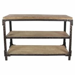Three shelves give you room to display favorite pieces of decor or organize books or DVDs on the DecMode Rustic 3 Tier Wooden Console Table. Strong iron provides a highly durable frame. The shelves are crafted from durable Chinese fir wood and engineered wood. Natural brown finishing lends this console table a rustic look.