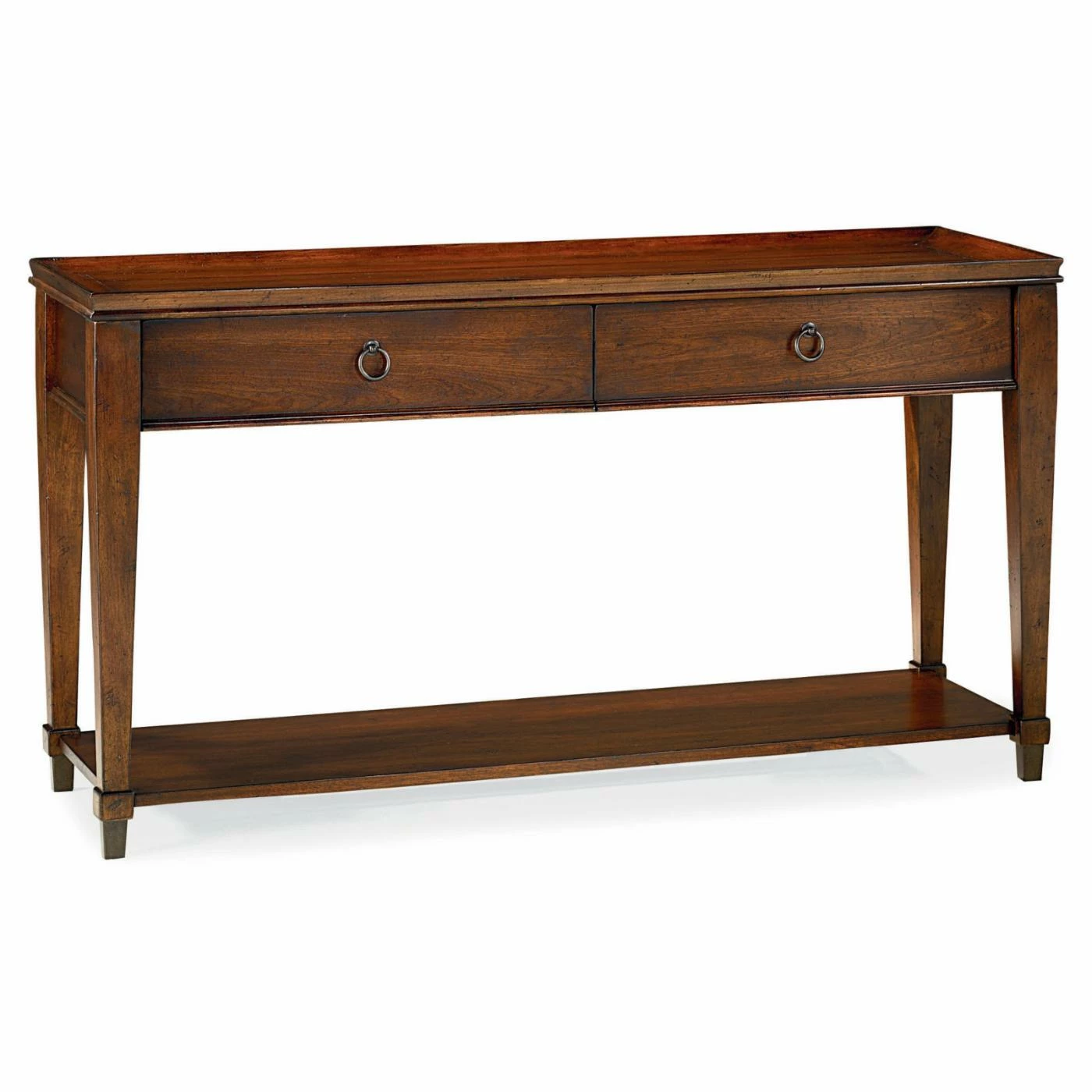 Crafted from solid wood with a rich mahogany finish, this Hammary Sunset Valley Sofa Table – Rich Mahogany makes the perfect accompaniment to your sofa. The large surface space is ideal for flower arrangements, decorative heirlooms, and books. Two large drawers keep miscellaneous items orderly and out of sight. The lower shelf can be used to store more books, throw blankets, and more.