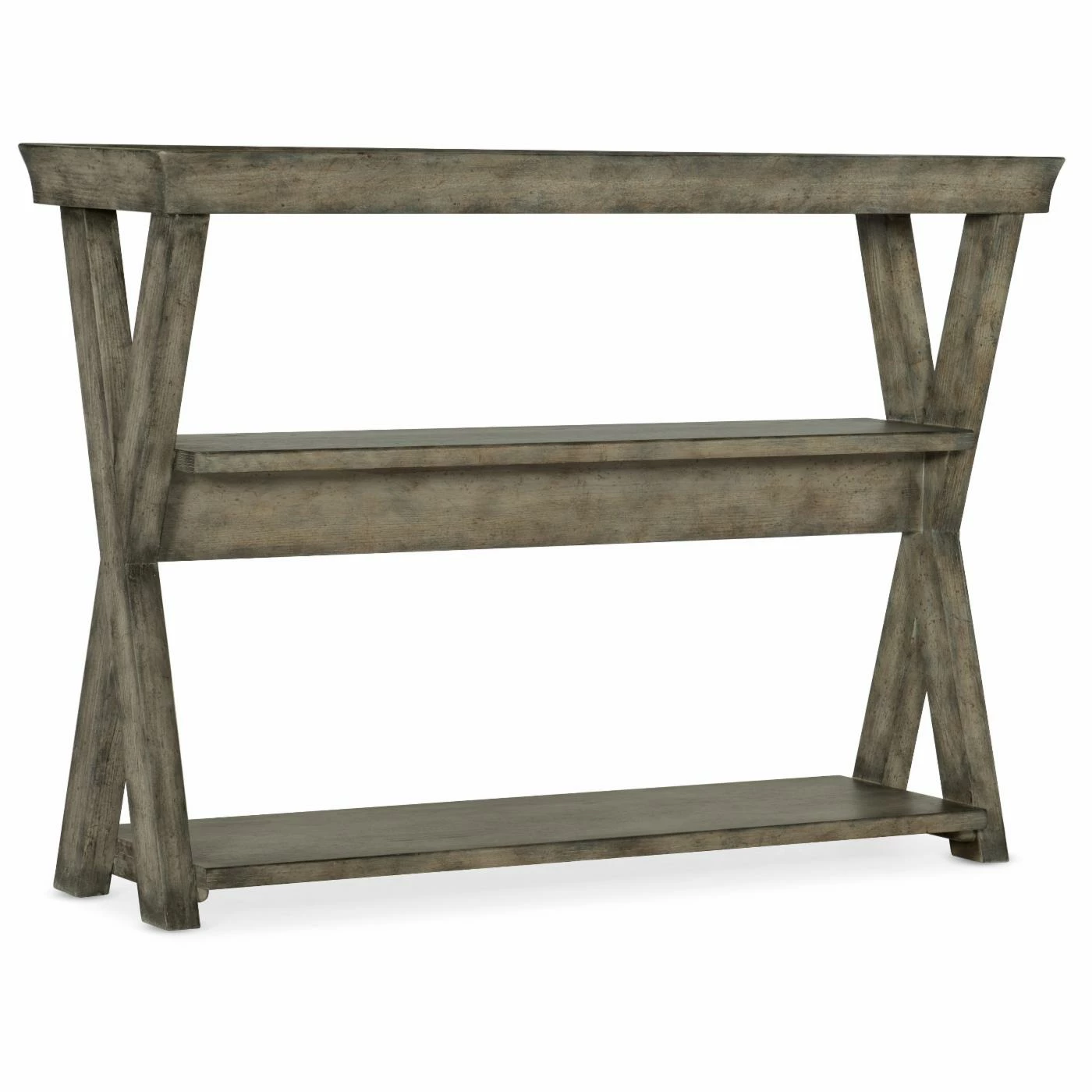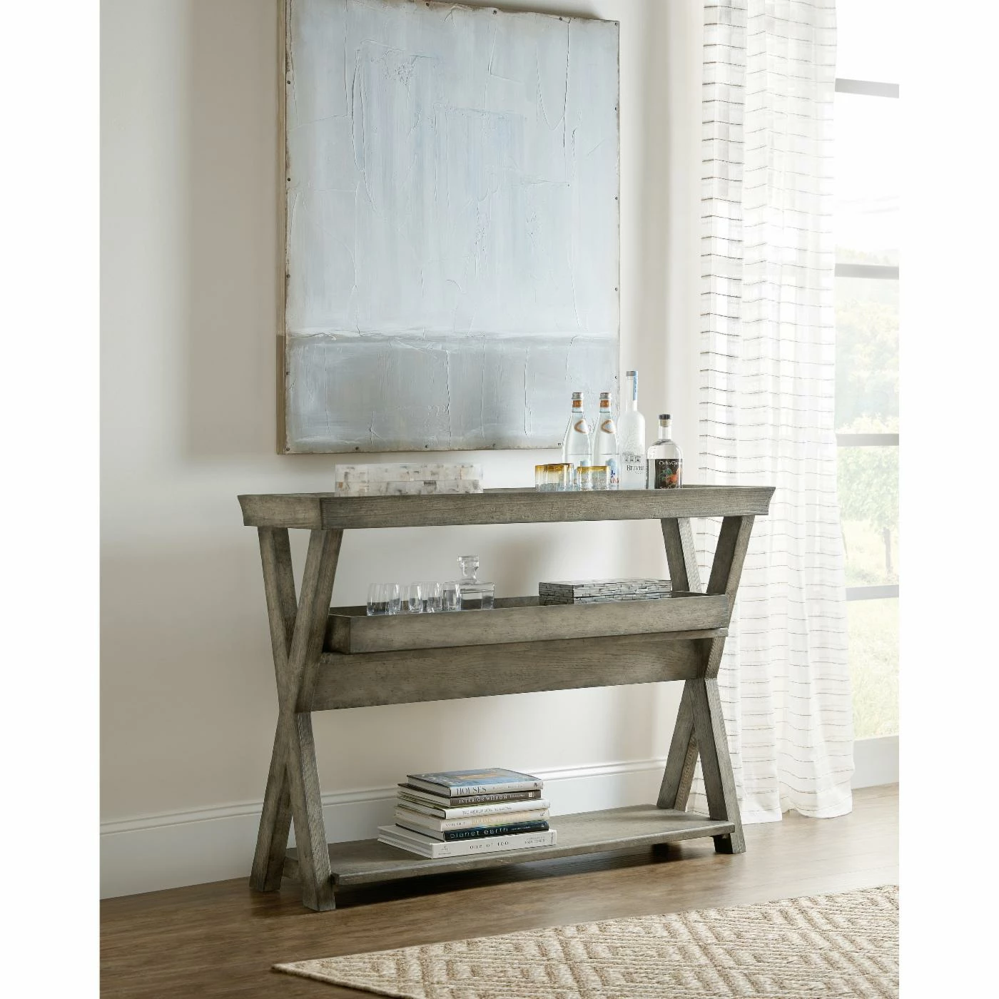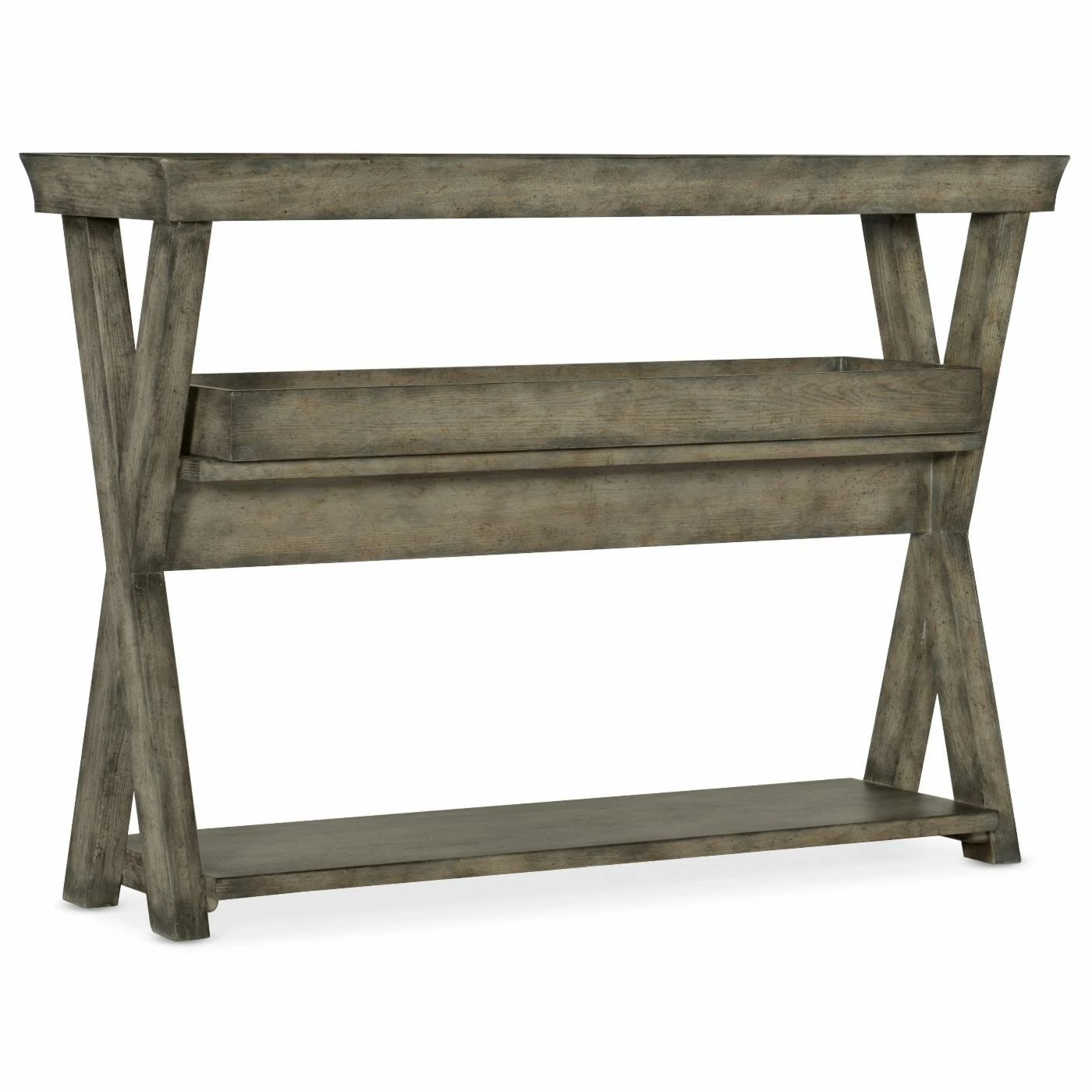 Chic and practical, the Hooker Furniture Alfresco Pertuso Tray Top Console Table is every hostessβs best friend. Delight friends and family serving them with the removable tray, and use the fixed top shelf as a serving surface during mealtime or cocktail hour. The stylish X-base design has 2 fixed shelves and a removable serving tray, and is crafted of oak veneers.