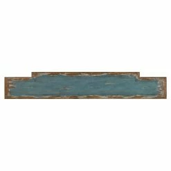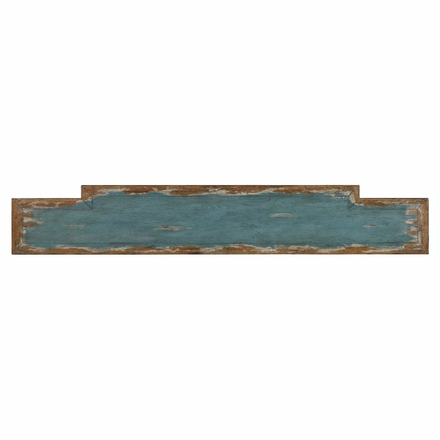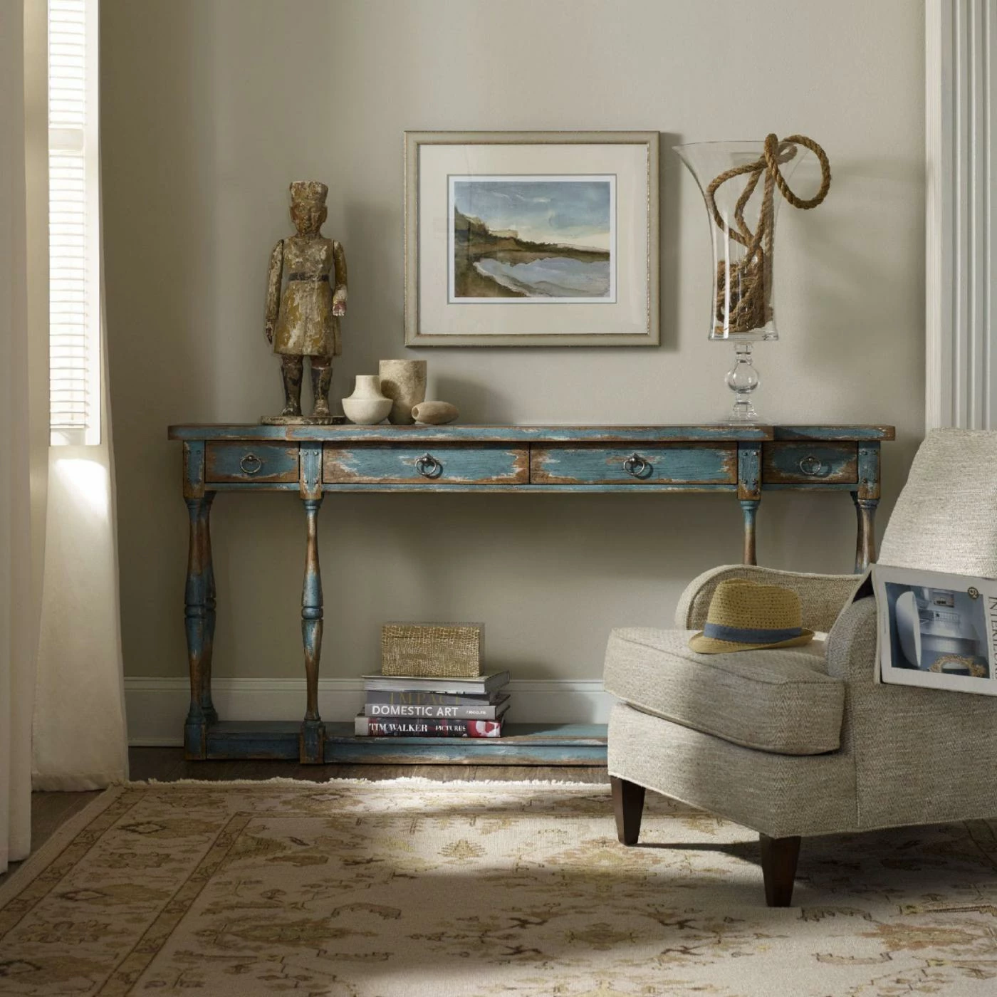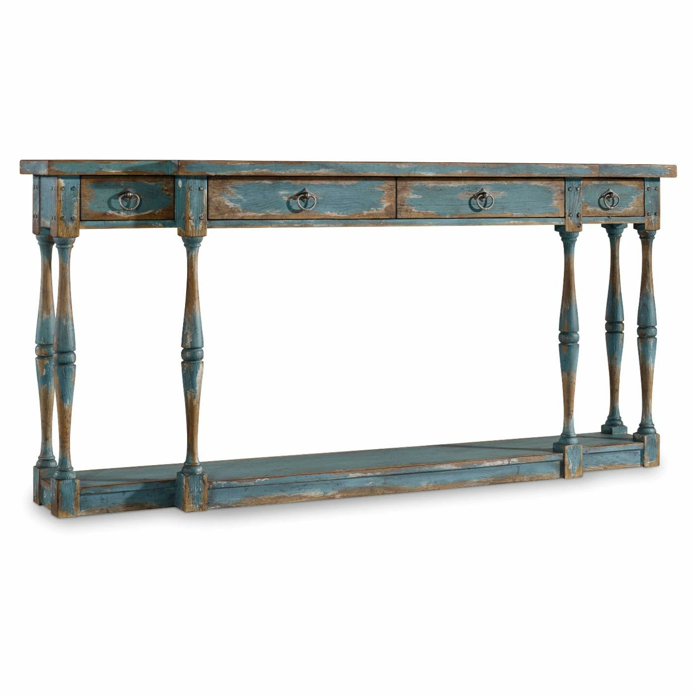 The heavily distressed Hooker Furniture Sanctuary Four-Drawer Thin Console will add character to any foyer, hallway, dining room, or living space. It is constructed from poplar and hardwood solids with pecky pecan veneers in a Sky High Azure blue finish. Features include a spacious display top, four drawers with ring pulls, carved and turned columns, and an open base shelf. The artfully applied wear and tear gives the console all the appeal of a family heirloom that’s been handed down from generation to generation. Some assembly is required.