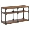 The Magnussen T1755 Pinebrook Wood Rectangular Console Table has an open look with a hand-made feel. This sturdy piece features a rustic iron frame (with riveted accents) that supports a top and bottom shelf made of fine pine solids. Both shelves are treated with a distressed natural pine finish that emphasizes the reclaimed look. This piece looks great against a stone wall or when paired with antique or refinished wood pieces.