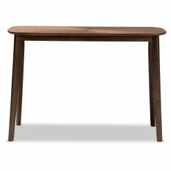 Augment your living room or foyer with Baxton Studio Wendy Slim Console Table. This slender, wide table has a minimalist mid-century modern look with a spill-over, rounded top and angled legs. The piece is made from solid rubberwood for maximum durability. A handsome walnut brown finish tops the frame.