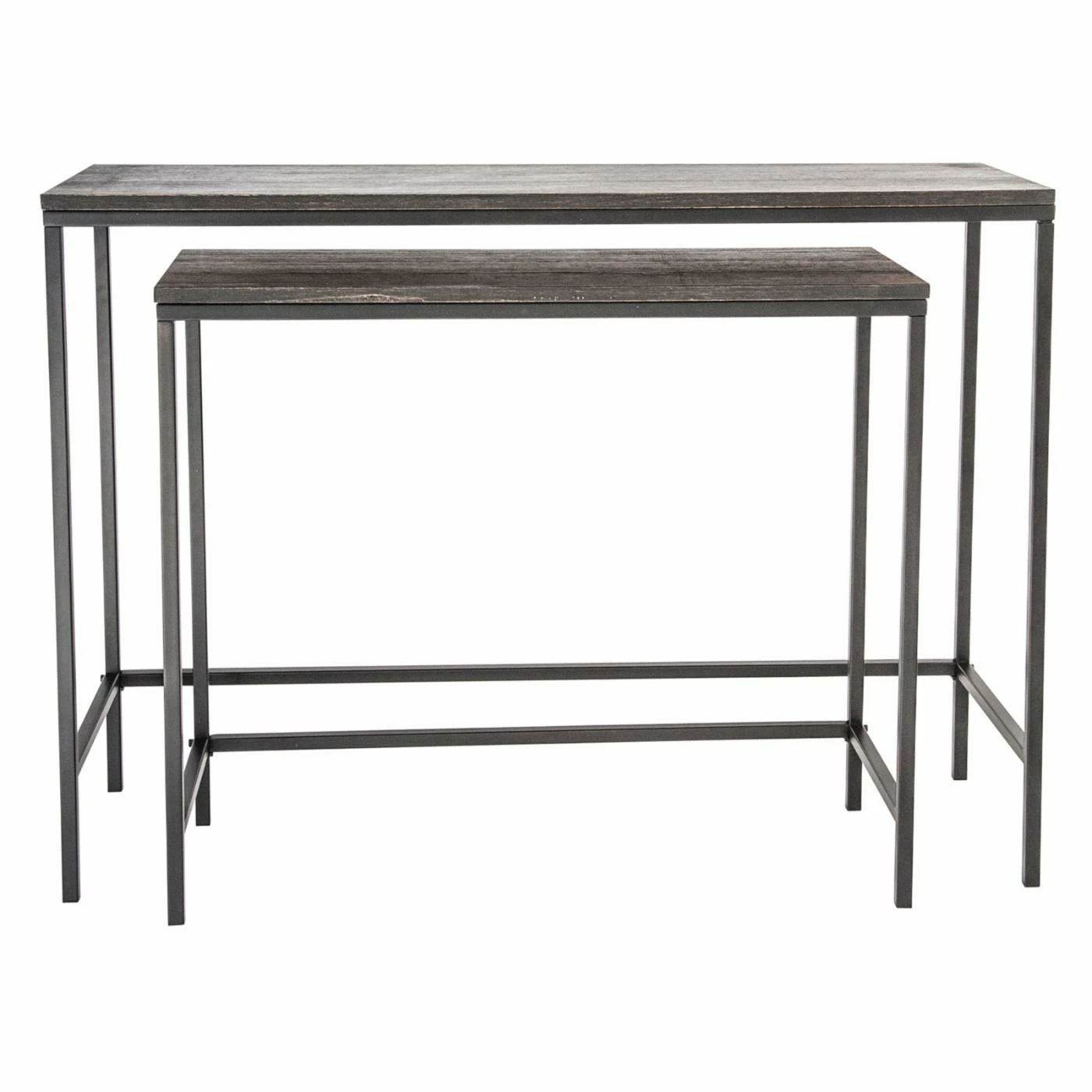 Space-saving design meets chic style with the Sprinkle & Bloom 2 Piece Nesting Console Table Set. This set includes one small and one larger table which nest together to take up a smaller footprint when they’re not in use. The black metal frames hold up lightly distressed oak veneer tops. Perfect for farmhouse or rustic decor.