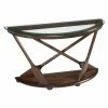 Welcome the Benzara Chanti Console Table into your new living room or foyer design for a compact modern space for storage and display. This table has a half-moon frame built from thick wood with tapered block legs. The curved face features two built-in drawers with framed edges and double metal knobs. A half-moon lower base shelf offers additional usable space. Dark espresso brown tops the wood.