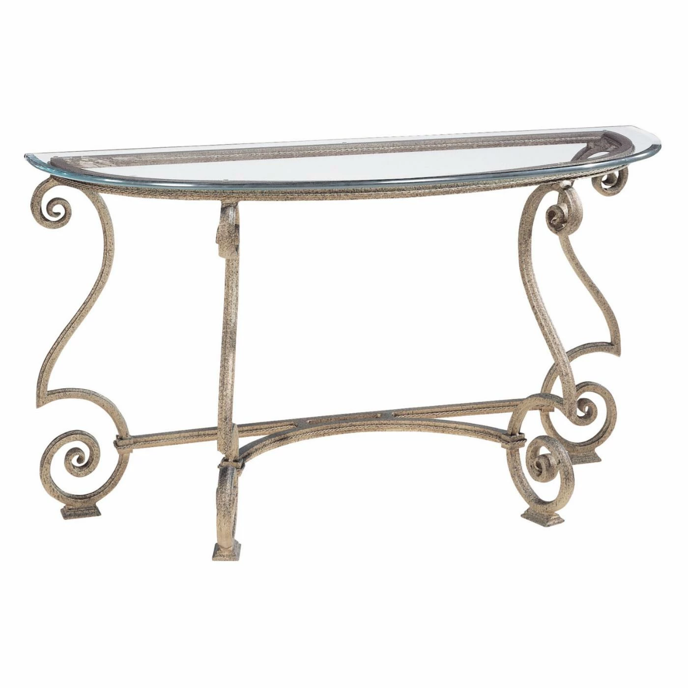 A demilune shape makes the Bernhardt Solano Console Table an elegant and smart addition to your entryway. This tall, slim yet wide console table would also fit neatly against the wall in a hallway. It features a thick clear glass top with shaped dupont edge and ornately curved iron legs in a textured antique bronze finish. For a cohesive look, pair it with other pieces in the Solano collection.