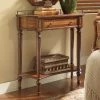 The graceful demilune shape of this Butler Specialty Masterpiece Hampton Demilune Console Table makes it a versatile beauty. Its shape ensures this console will feel right at home in your foyer or behind the sofa. Its stylish take on a classic design includes tapered legs, wood block accents, and matched cherry veneers on the top and apron. The distressed driftwood finish allows the wood grain to shine. This console table is carefully crafted from select hardwood solids and cherry veneers. It features a hidden center storage drawer for added convenience.