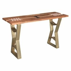 Handcrafted by skilled artisans, the Chic Teak Charleston Acacia Wood Console Table has a unique, rustic look. The U-shaped metal legs are in a gold finish and feature geometric accents, while the table top is made of acacia wood in a honey brown finish. White cloth laces add visual interest to the table top. Style this piece in your living room as a spot to display your favorite photographs, or place it beneath a wall mirror and create a space to get ready each morning. Some simple assembly is required.