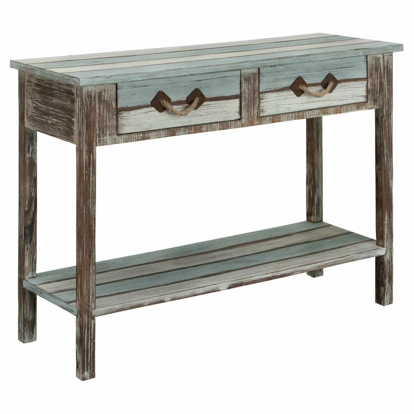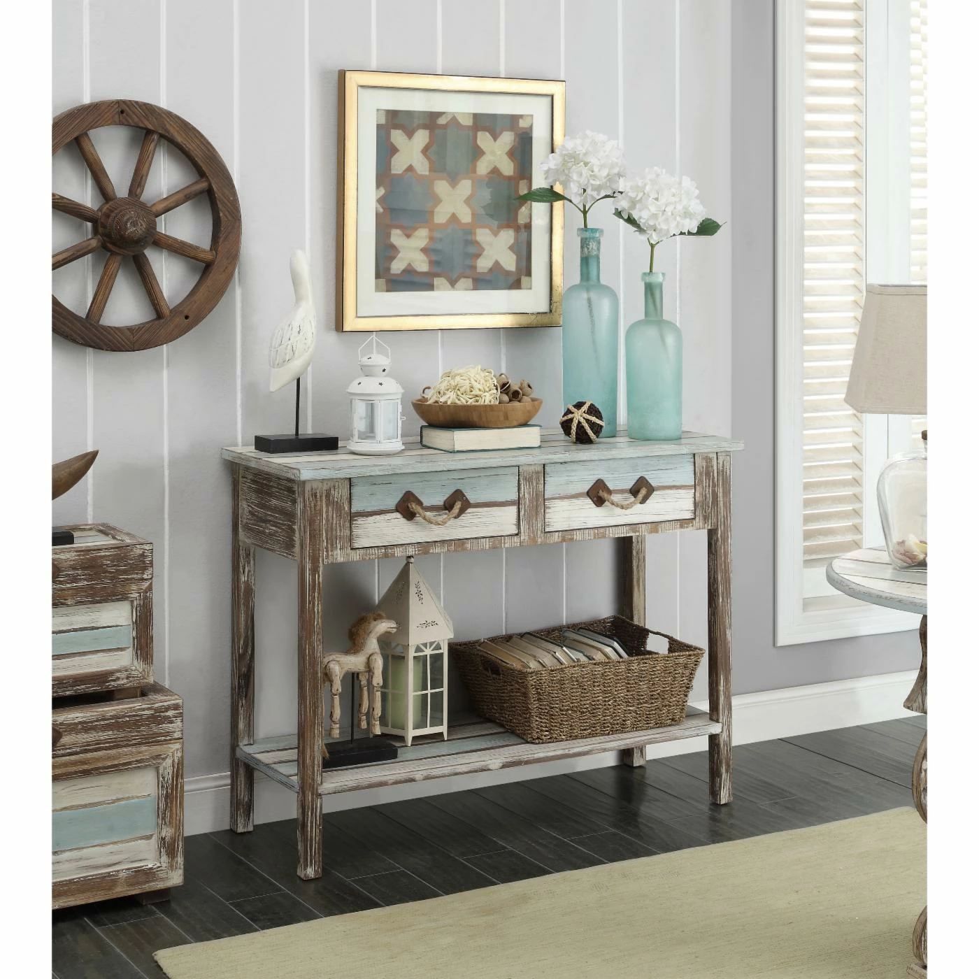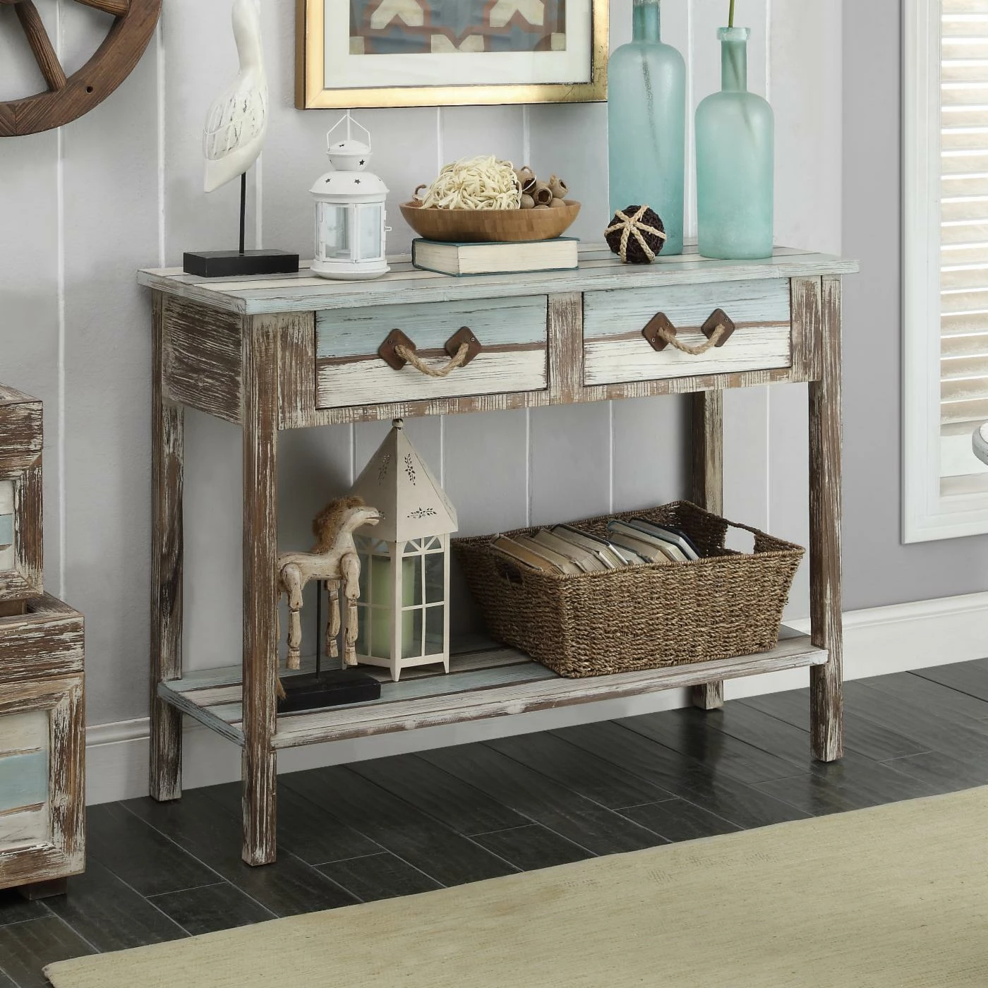 In any room, add ocean inspiration with the Coast to Coast Islander Rectangle Console Table. This lovely table features a spacious top and shelf for displaying photos and figurines, framed with a distressed wooden design in marine hues to create a beachy, coastal feel.