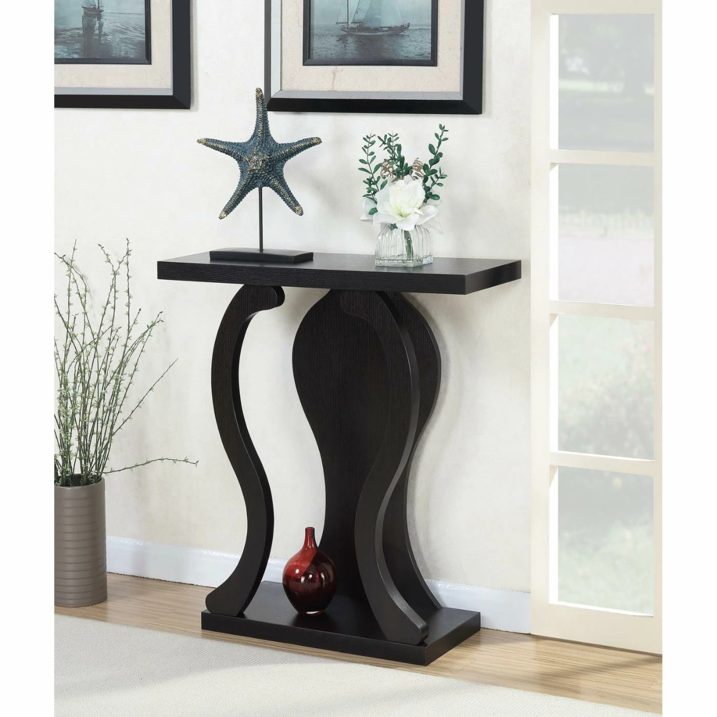 With graceful curves and a modern profile, the Convenience Concepts Newport Terry B Console Table adds interest and elegance to any room in your home. You can use this table to show off your favorite curios or add a lamp to the top. You may also style the bottom for added display space or keep it empty for a simplified look. The rich espresso finish complements many color schemes, while its engineered wood and particleboard construction is made to last.
