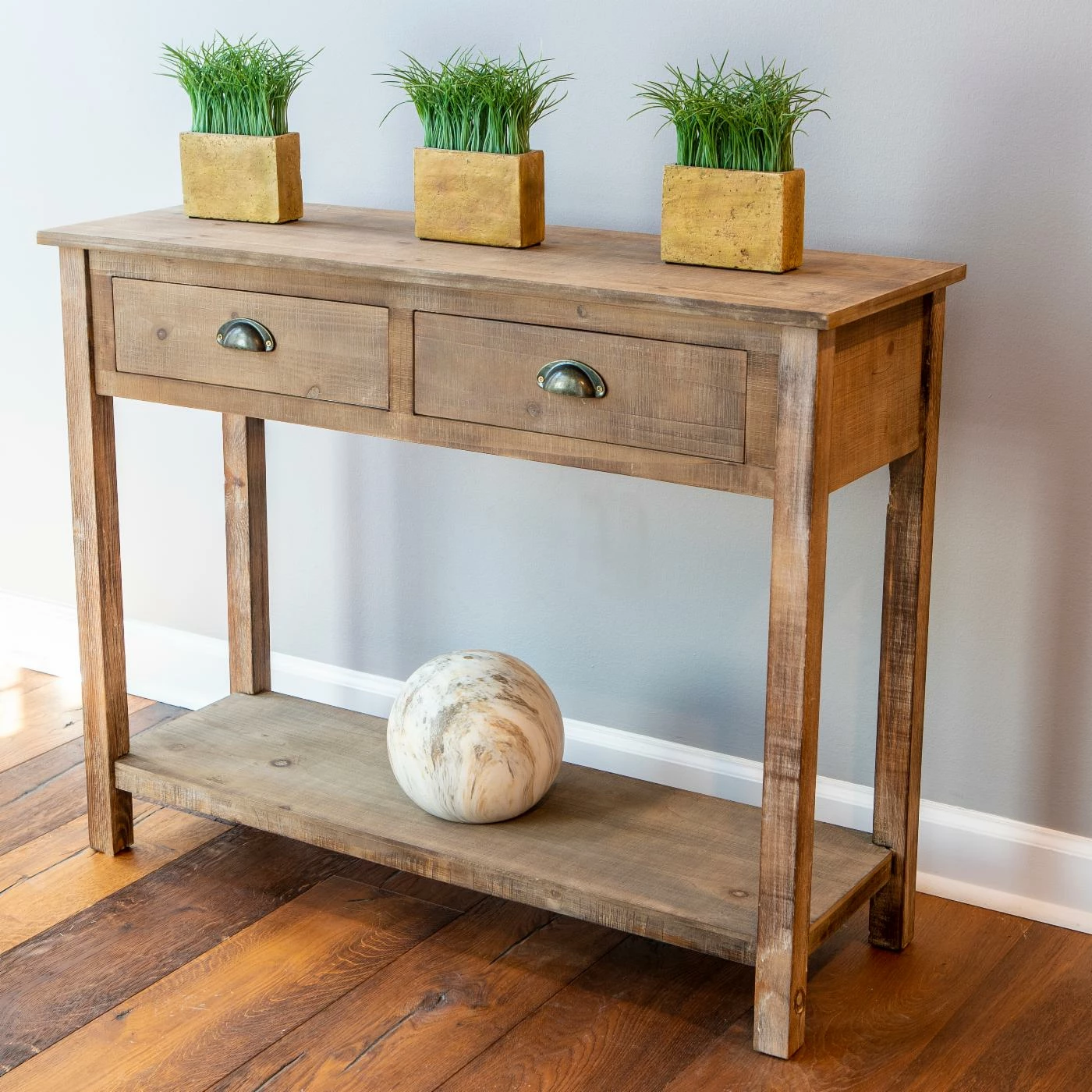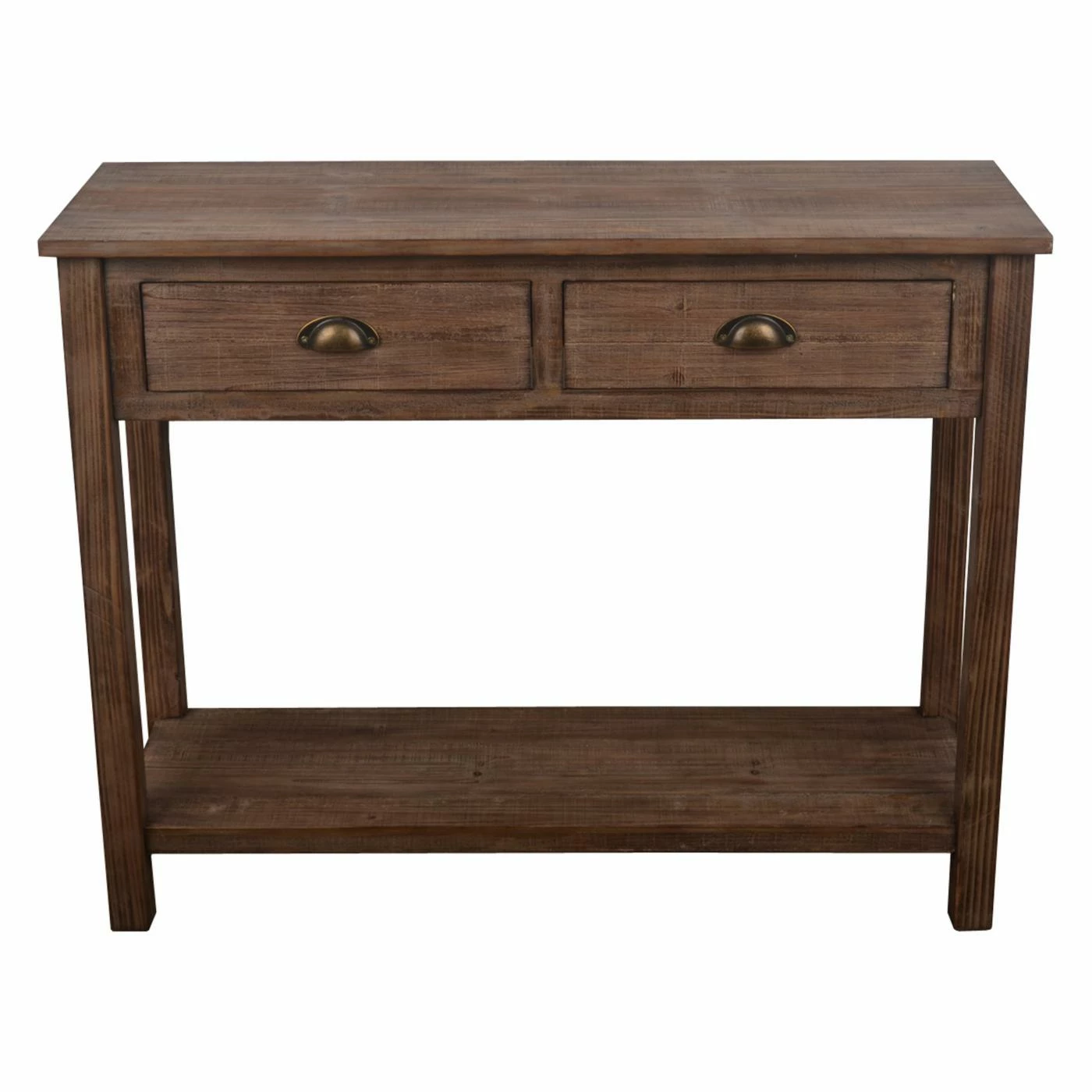 The Decor Therapy Wood Top Console Table makes a stunning accent for your foyer, hallway, or living room, offering both storage and display in one attractive package. The frame of the table is crafted from tough wood and finished in a fine distressed brown. Two drawers and a lower display shelf combine with the spacious top to suit all your needs. The drawers feature solid metal handles with a bronze finish.