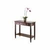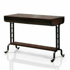 The contemporary design of the Furniture of America Fenna I Sofa Table gets an industrial twist with the black metal accents and legs. A stunning addition to any home, this sofa table features an antique oak finish which complements most homes. Its two drawers offer the perfect space for holding devices, office supplies, and other small items, while the slender, single shelf can be left empty or used to display your favorite decorative piece. Crafted from wood for strength and durability, this sofa table will look fetching for years to come.