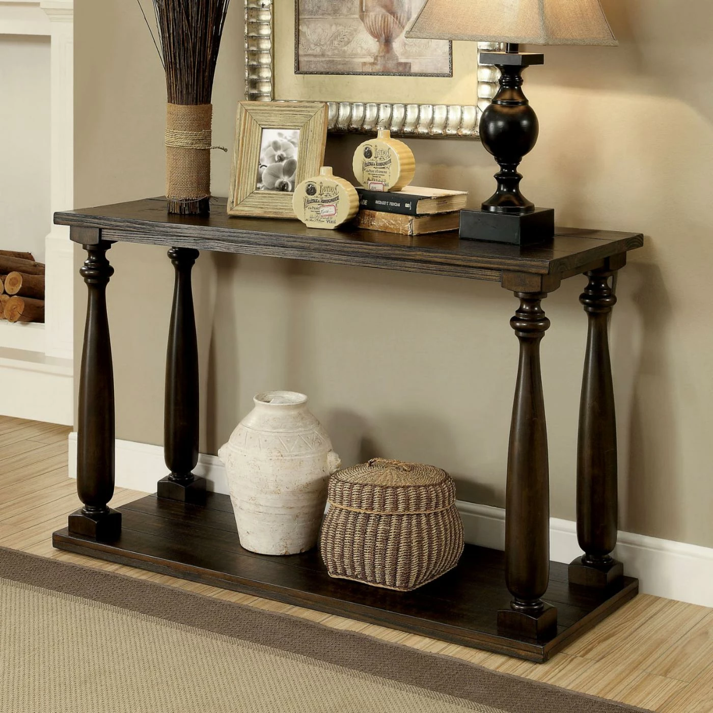 Sleek and casually elegant, the Furniture of America Shandy Transitional Style Turned Leg Sofa Table is crafted of solid wood and wood veneers with a gleaming, dark walnut finish. The sturdy look of this sofa table is perfectly balanced by the open design that shows off your favorite knick-knacks, woven baskets, and pottery. The generously-sized tabletop does double-duty as a decorative display and catch-all for media, reading material, and lighting display. The turned leg design of this sofa table offers versatile styling options for more traditional or transitional dΓ©cor.