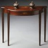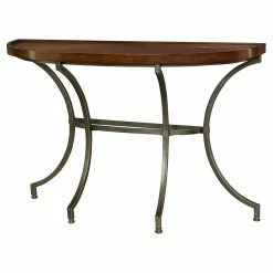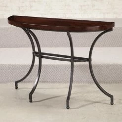 This Hammary Barrow Sofa Table – Mahogany perfectly hugs the back of any sofa or entryway wall, creating airy surface space. The metal base with curved legs artfully supports the mahogany tabletop.