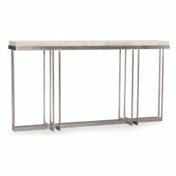With its simple design, the Hooker Furniture Melange Blaire Console Table is a fashionable fit for your space. Its narrow footprint is convenient for hallways and small foyers, and the frame is crafted of tubular steel in a pewter silver finish. Even better, the tabletop is crafted of onyx in white and cream tones, setting an elegant scene for vases, home accents, and more.