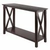 Add dramatic flair to your living room or foyer with the Hooker Furniture Melange Giles Console Table. Whereas some consoles and credenzas safeguard your items behind boring glass, this dynamic display has a decorative metal frame that culminates in a glamorous lattice set before two full-width wood platforms. Each shelf is crafted of poplar and hardwood solids with golden madrone burl veneer, as is the generous top. Show off art and prized collectibles, brighten the room with accent lighting or freshen the air with a peace lily or two! No assembly is required.