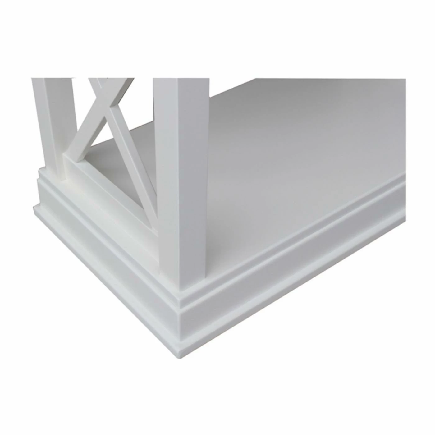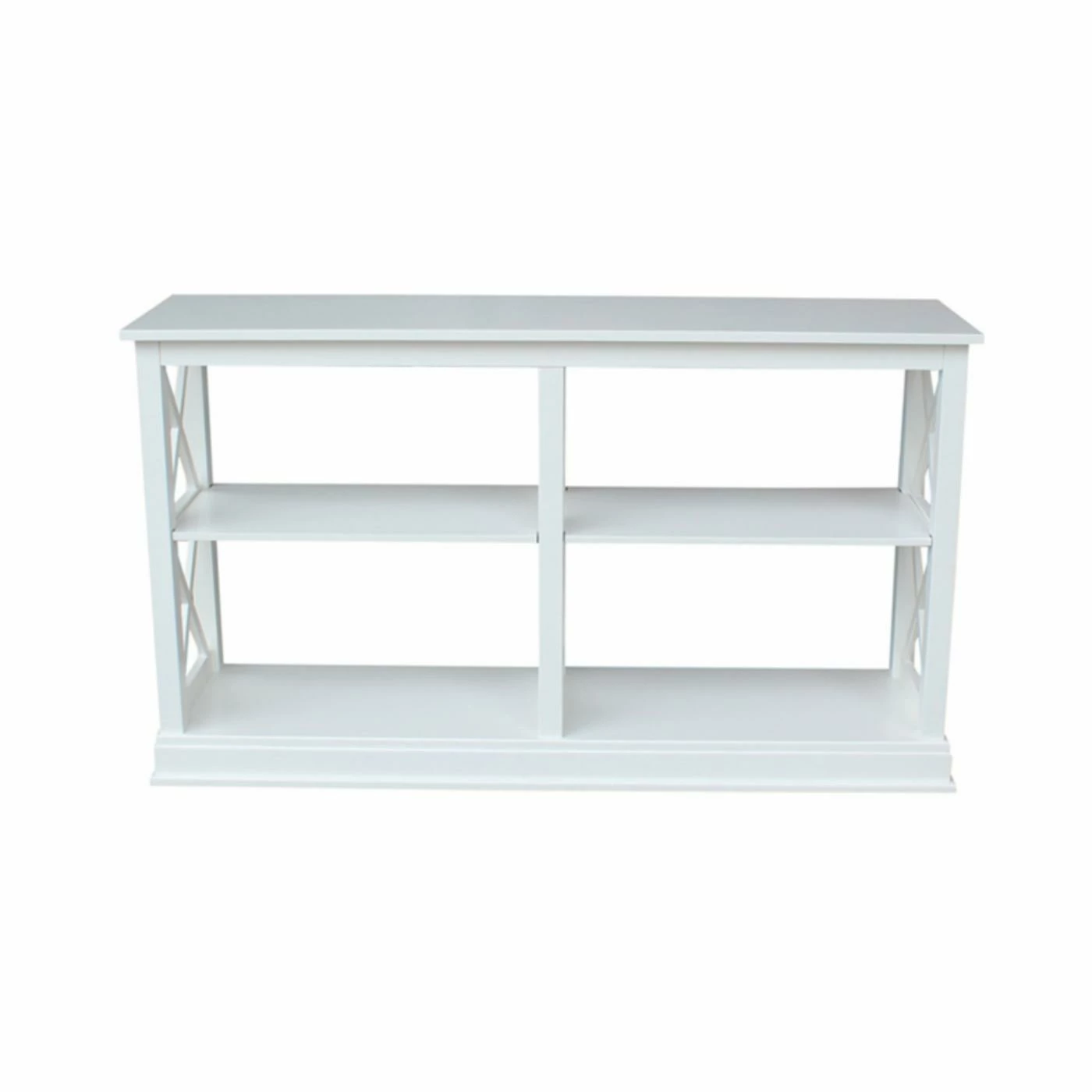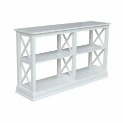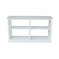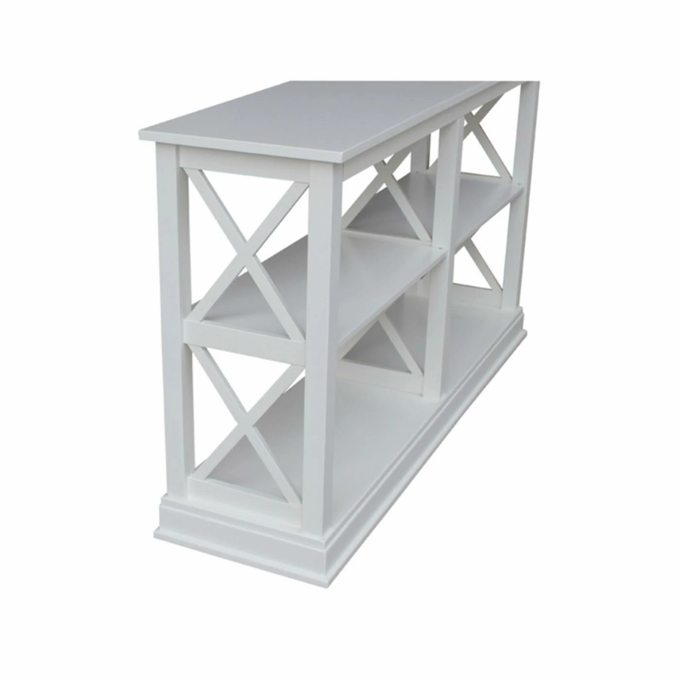 Yes, the International Concepts Hampton Sofa Table can nestle behind a sofa, but itโs also appealing against a wall or as an airy room divider. Display books or objets dโart on the broad open shelves to make a statement all your own. This ready-to-assemble console table is crafted of solid wood and comes in a versatile white finish.