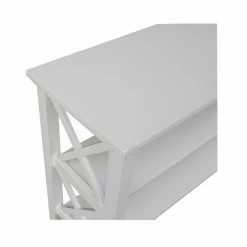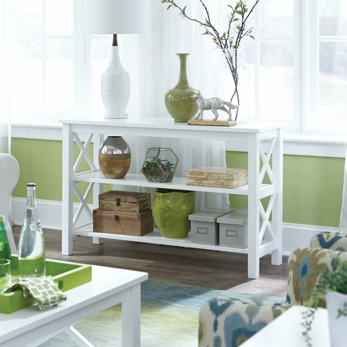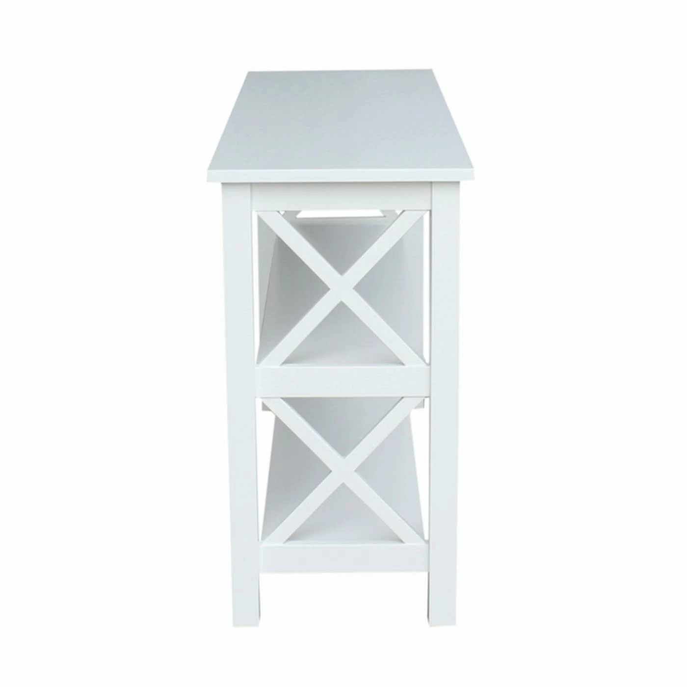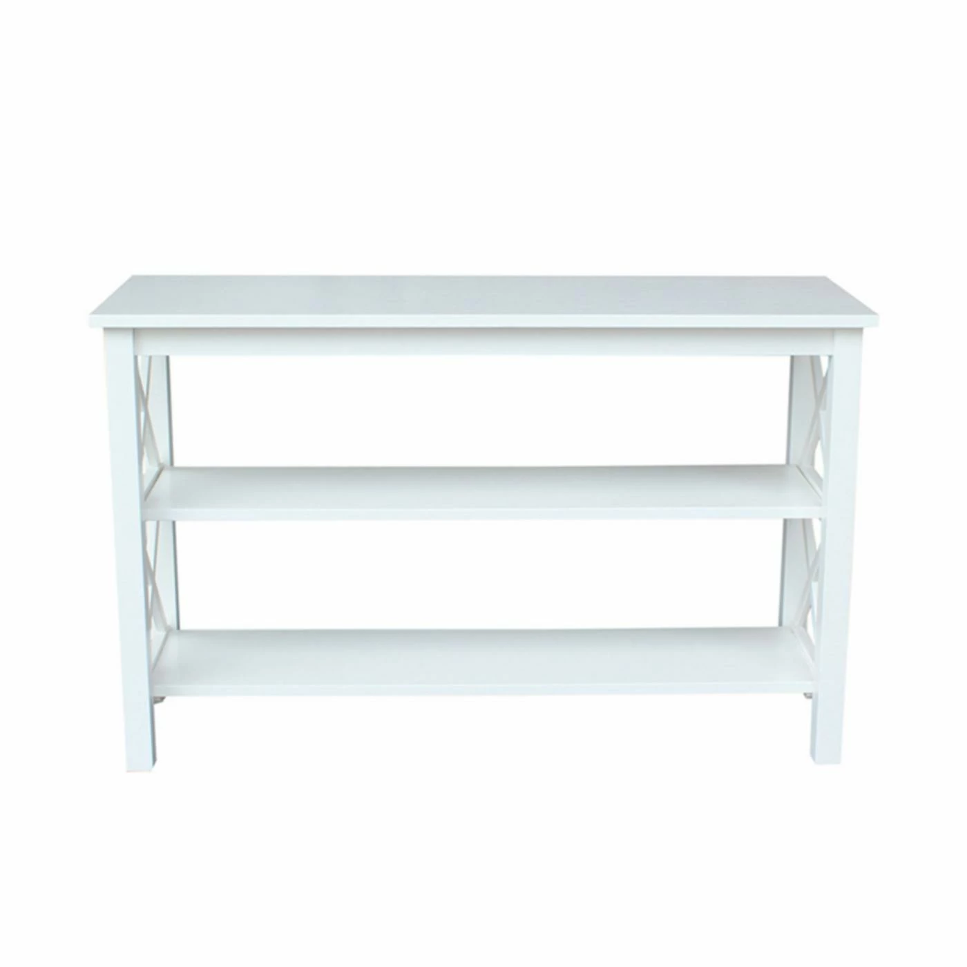 Score extra display space while decorating your living room or foyer with the International Concepts Hampton Console Table. Make a personal statement by arranging personal mementos, books, and art objects on the open shelves. Strong solid wood construction ensures longevity. The thick table top is constructed in the style of a butcher block. Assembly is required.