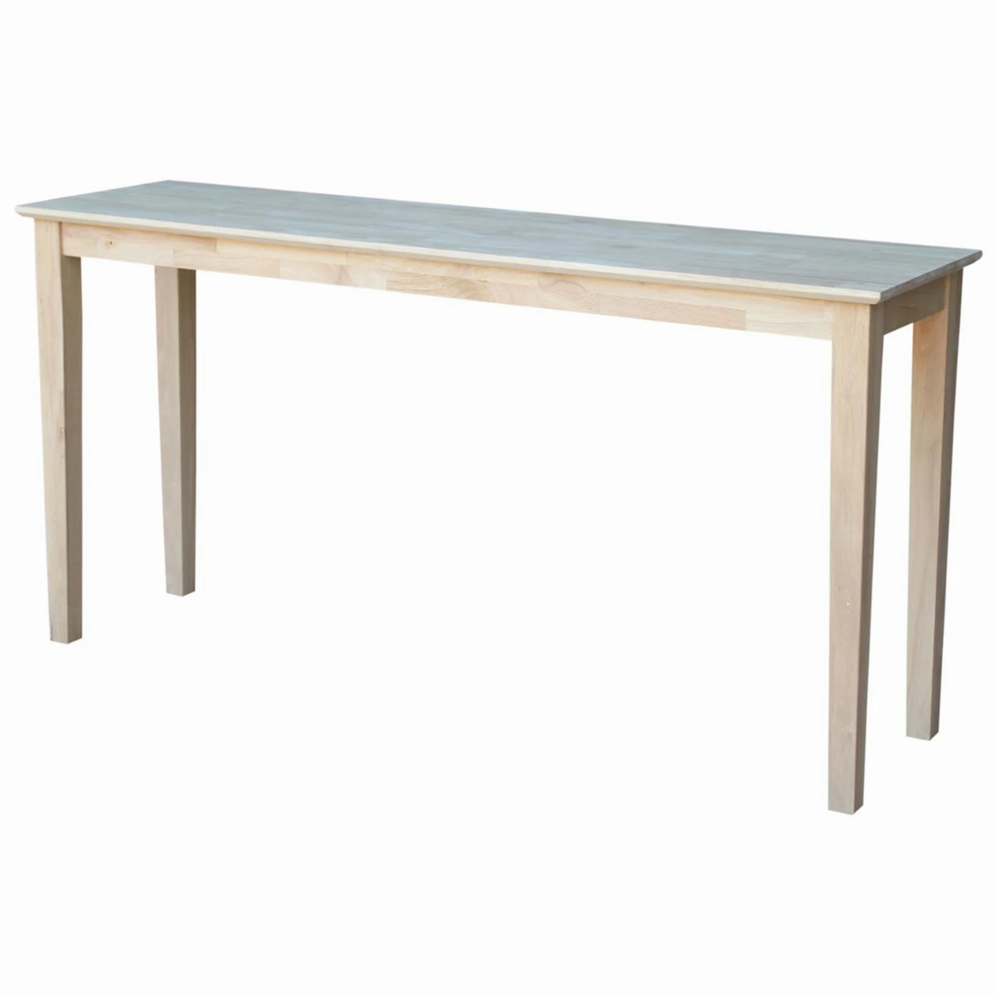 This tall, slim, and spacious International Concepts Shaker Console Table fits behind the sofa or in a hallway. Its Shaker look includes tapered wood block legs that work with any interior design. This solid wood console table comes unfinished, which means you get to custom stain or paint it as you choose.