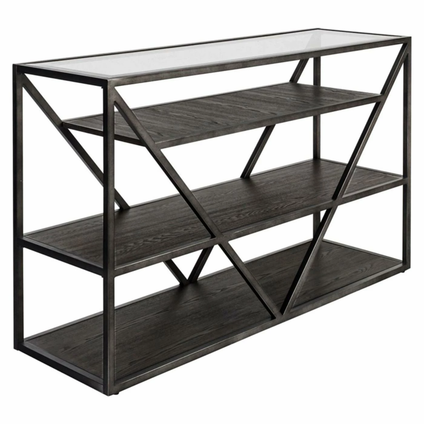 Add chic industrial flair to your home with the Liberty Furniture Industries Arista Sofa Table. This sofa table is made for stashing books and magazines on its ample shelving, or for resting your beverage on its tabletop as you lounge on the couch. Its V-shaped trestle frame is built from sturdy metal in an aged pewter finish and lends an intriguing angular geometry to the piece. Its three ash gray wooden shelves are complemented by a transparent beveled glass tabletop for an added touch of sophistication.