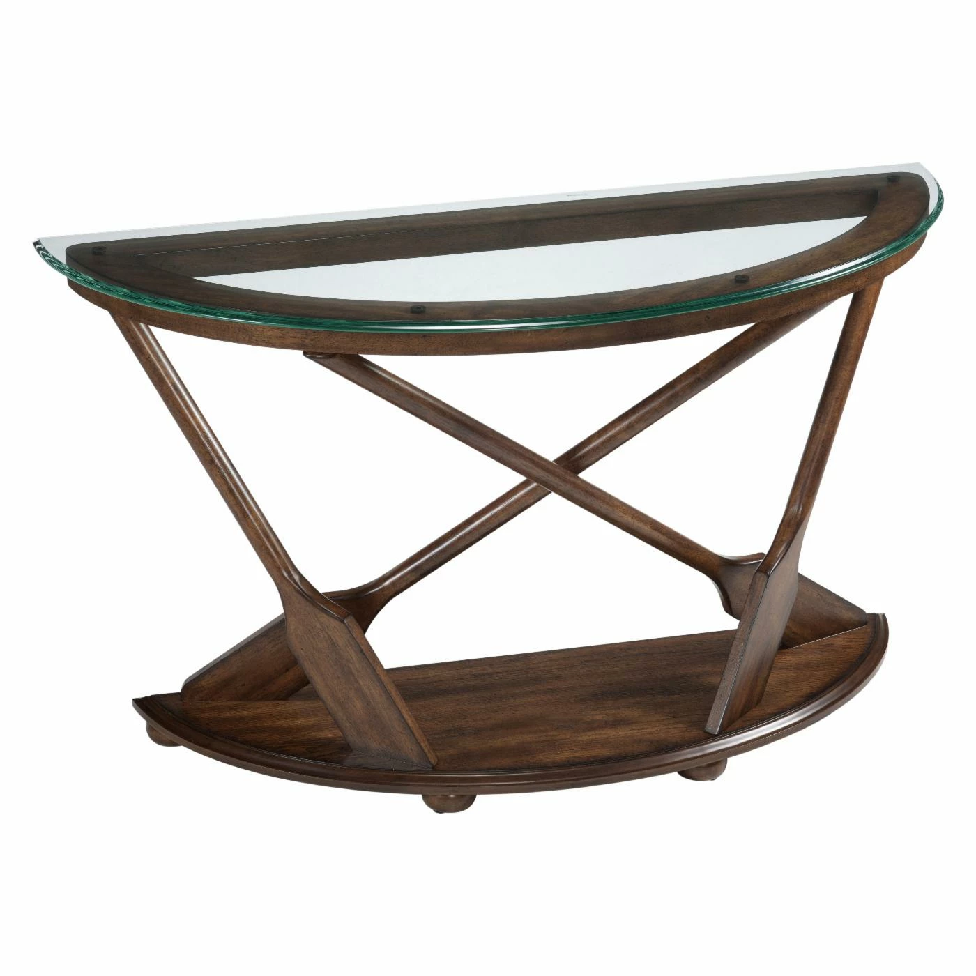 Nautical-inspired that’s luxurious instead of whimsical, this Magnussen Beaufort Demilune Sofa Table is striking and practical. It’s well-made of hardwood solids and oak veneers in a distinguished dark oak finish. Four oars add contemporary charm. This table has a demilune shape with lower shelf and is crowned by a clear glass top.