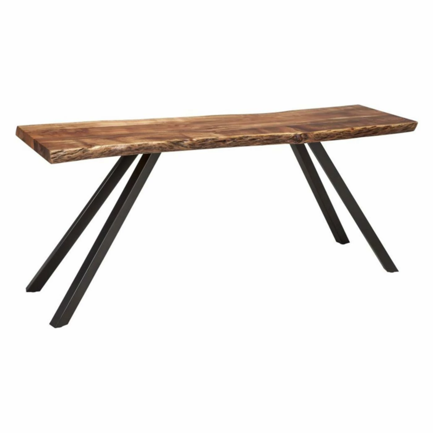 Dramatic details make the Modus Reese Rectangular Console Table a striking addition in your foyer, hall, or behind the sofa. This console table stands on dramatically angled iron legs in a powder-coated, black finish. It’s topped with a two-inch thick slab of solid acacia wood with natural live edges. A semi-gloss finish enhances the woodgrain and the natural live edges are sanded and sealed for a beautiful, splinter-free finish.