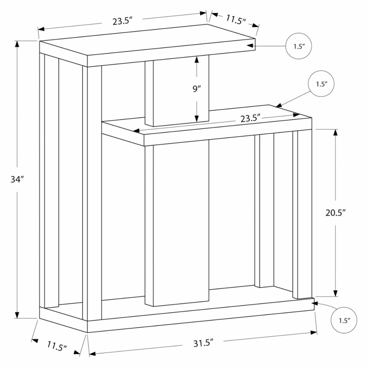 - Bottom shelf: 31.5W x 11.5D x 20.5H in.