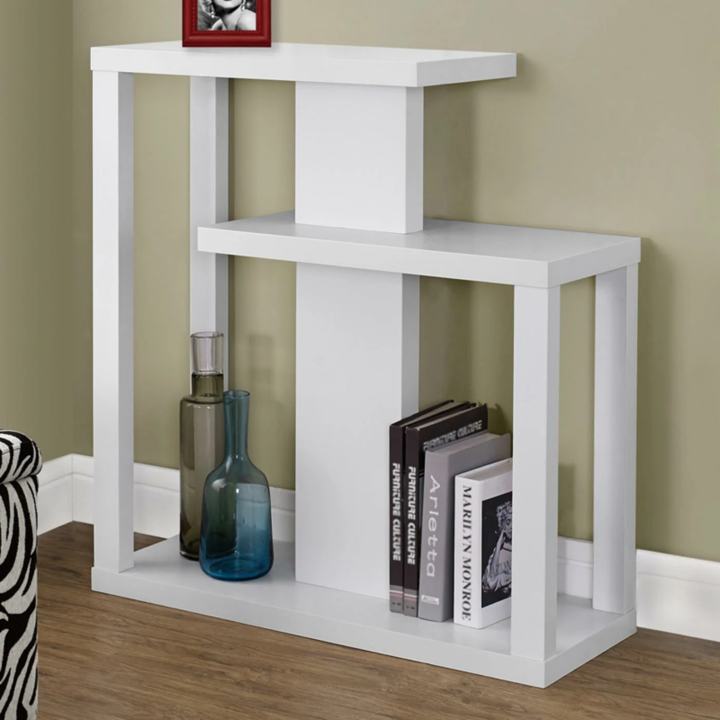 Staggered shelves and a strong, linear design give the Monarch Specialties Staggered Console Table its contemporary appeal. This console table makes the most of your display pieces by allowing natural space in between each level. This means your favorites can shine individually as well as in a group. This versatile beauty is perfect in your hallway, entrance, or anywhere that needs an extra jolt of style. Its durable engineered wood construction includes strong, squared legs, thick shelving, and your choice of select finishes.