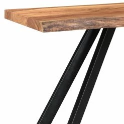 Live edge wood detailing on furniture brings warmth to your space and this table is no exception. The solid acacia wood table top has a natural burnt finish and is handcrafted, so each piece will be unique. The sturdy iron legs sit in an A-line, adding a dose of contemporary while keeping the top secure. Will work well with many different decor styles.
