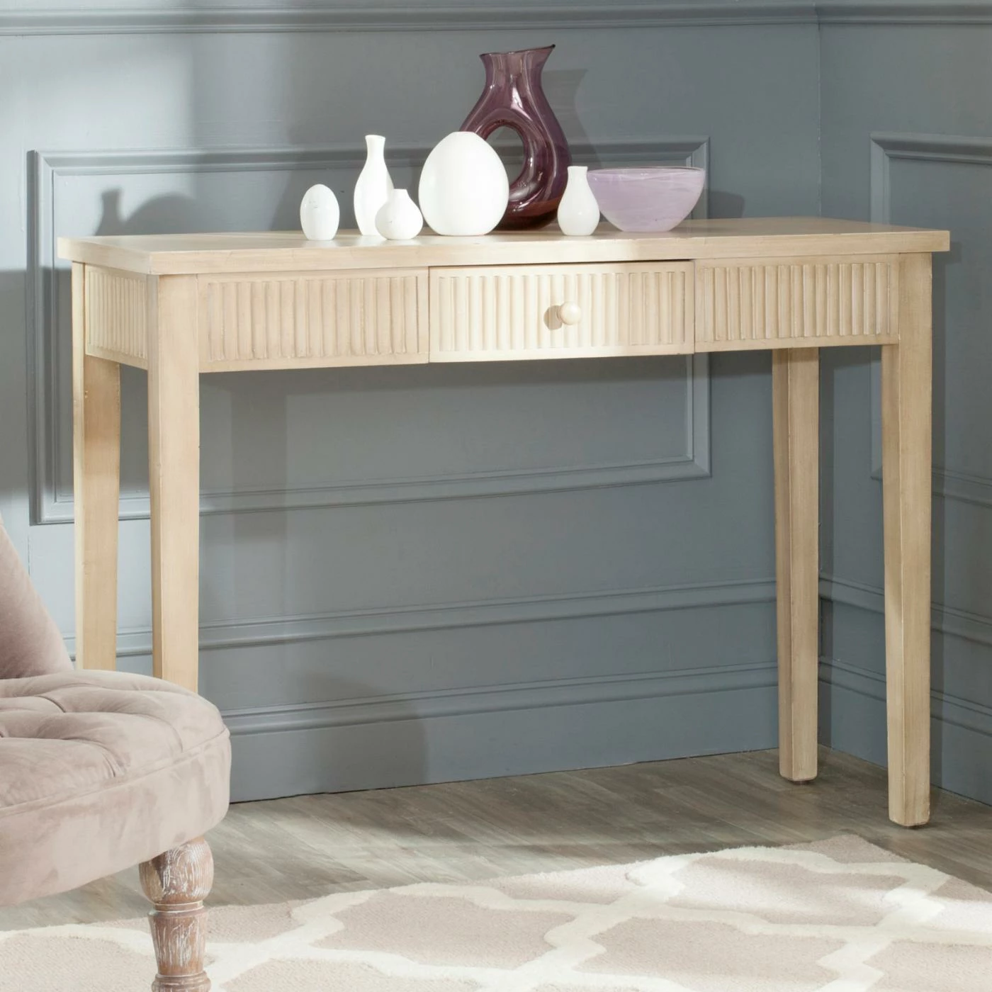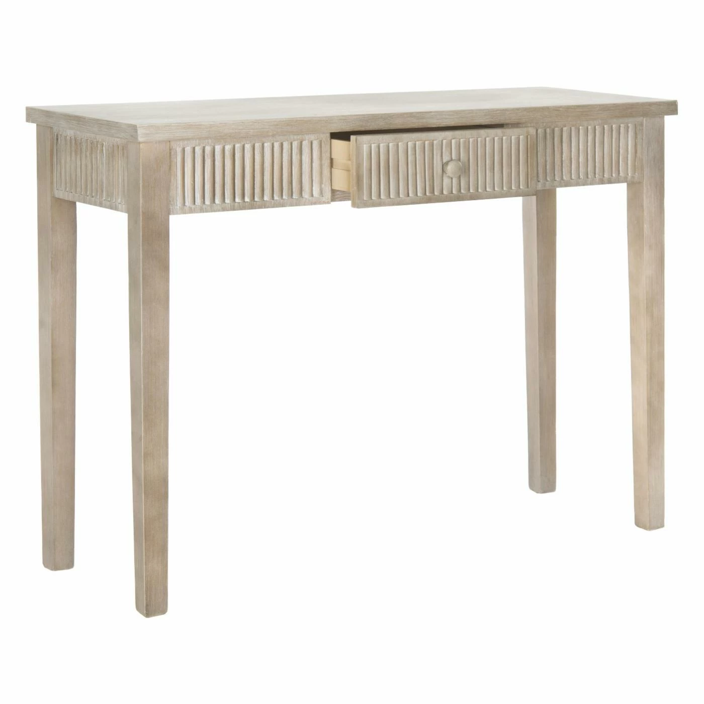Add more storage to your entryway or seating area with the Safavieh Beale Console with Storage Drawer. The fir and engineered wood console features a fluted frieze with a single storage drawer. Sold in your choice of available colors, the table has a simple rectangular top and squared-off legs to keep the emphasis on the ornate texture along the drawer front.