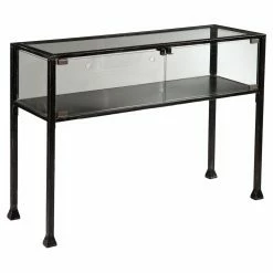 Display your succulents in style with this Southern Enterprises Terrarium Console Table. This console table doubles as a terrarium. It features a generous, clear glass terrarium top with two magnetic closure doors and air holes. This industrial style console table stands on a black metal frame.