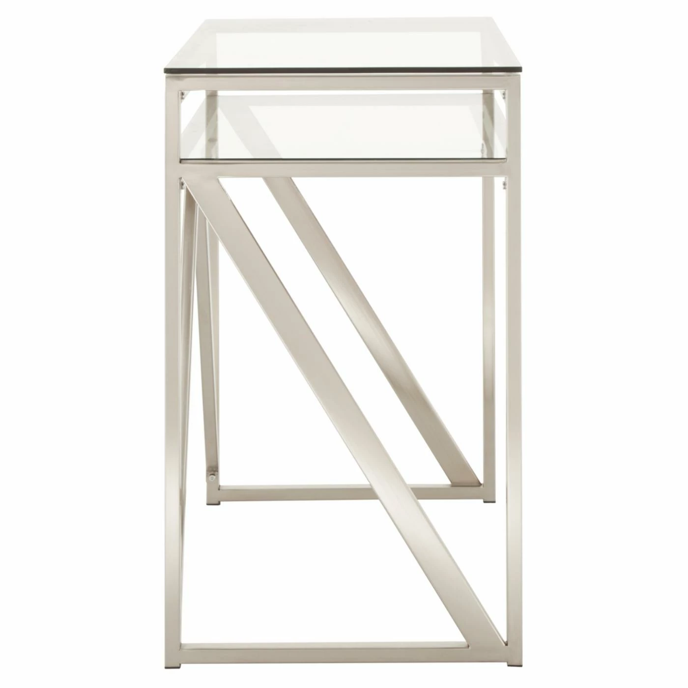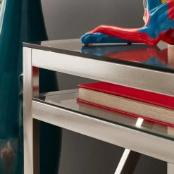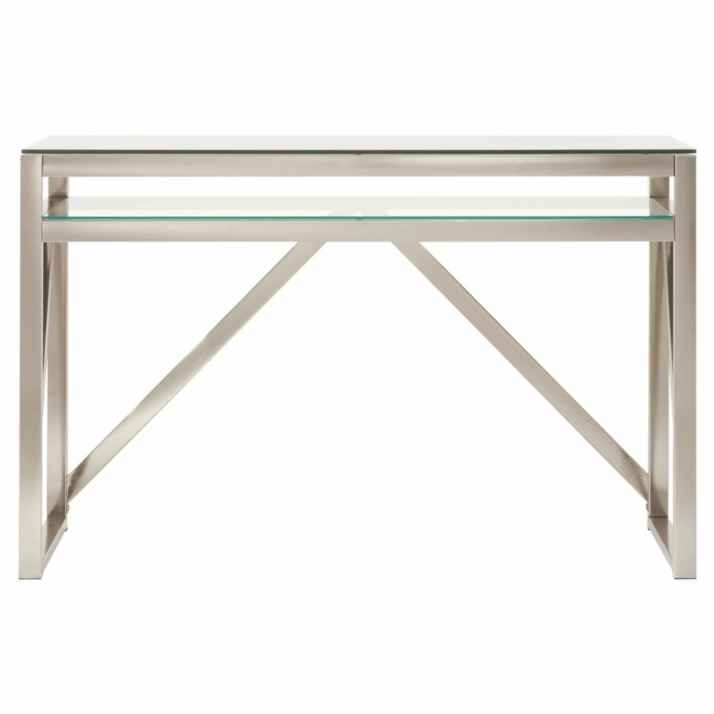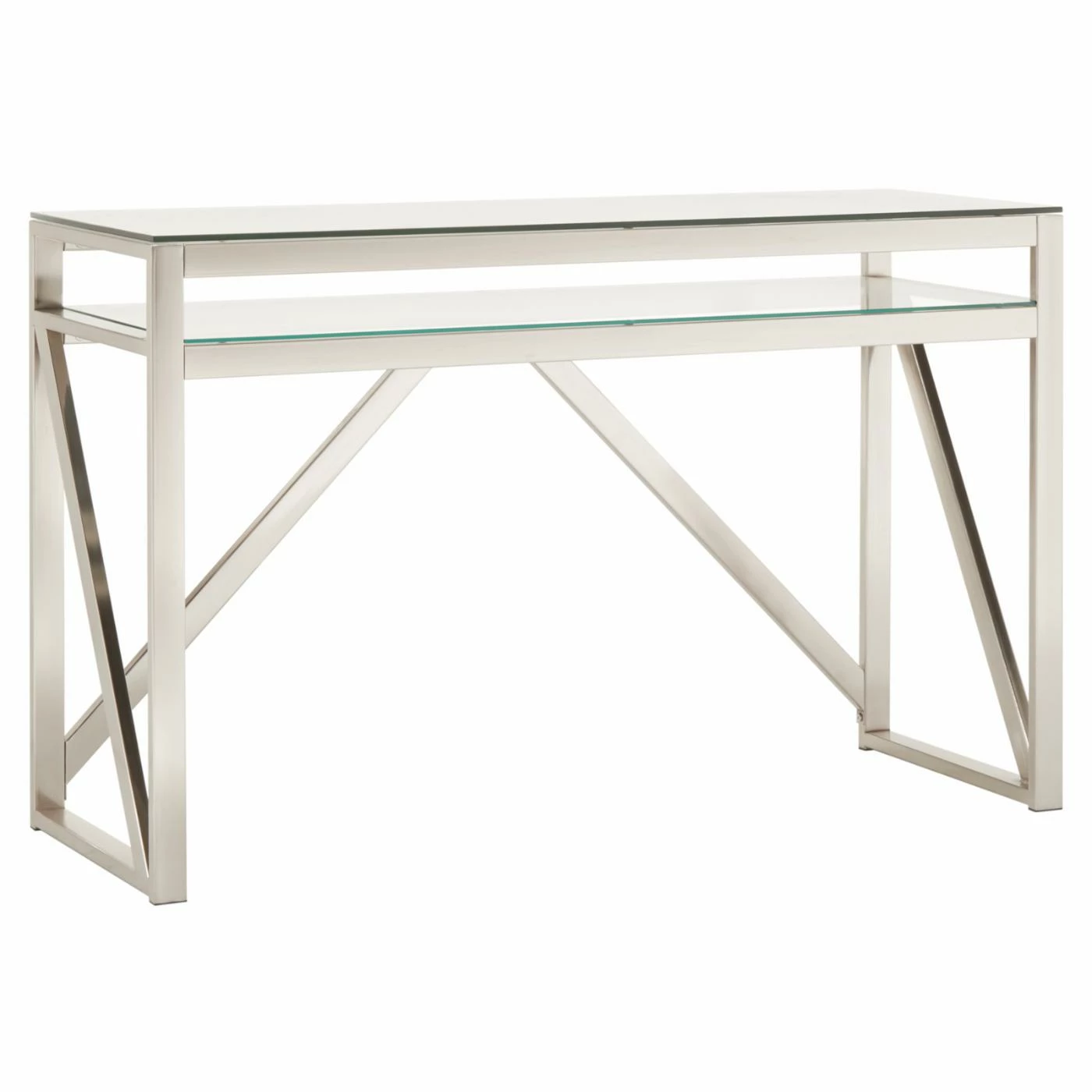 Add a touch of contemporary style to your living room with the Weston Home Erika Sofa Table. The metal base is in a brushed metal finish, and the open shelf is made of tempered glass, echoing the glass table top slightly above it. Angled bars create visual interest on the base, and the open shelf provides storage for your favorite books or other items. The shelf sits just below the table top, creating a mirrored effect. Use this modern sofa table to display your favorite home dΓ©cor pieces. Some assembly required.