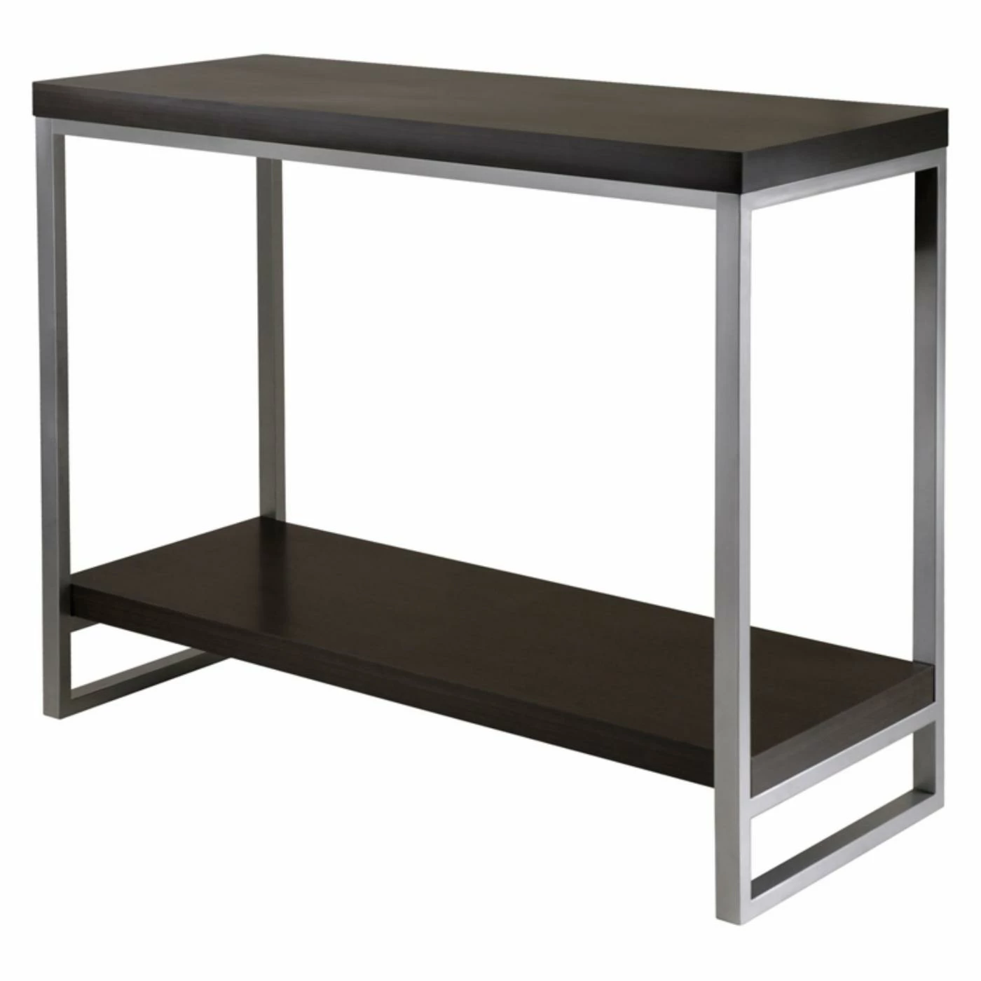 Clean, contemporary lines and handy display spaces make theWinsome Jared Console Table perfect for your foyer, hallway, or behind the sofa. An open rectangular shelf doubles the display space of this console table. Its top and lower shelf are built of wood and composite in a rich espresso finish. The linear metal tube framework features a sled style leg base and brushed silver finish.